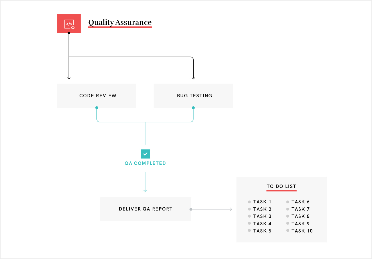 - Code review – We review for consistency with the purpose, make sure the logic is fine and all potential implications are accounted for. We make sure it’s efficient and it adheres to standards. Everything we find will be highlighted in the code using comments and documented in a separate file that will be transferred to the “to do list”.